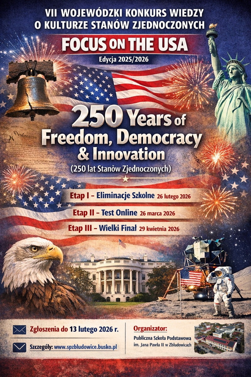 Serdecznie zapraszamy nauczycieli i uczniów szkół podstawowych województwa świętokrzyskiego do udziału w VII Wojewódzkim Konkursie Wiedzy o Kulturze Stanów Zjednoczonych FOCUS ON THE USA. Szczegóły w Regulaminie. Do zobaczenia :)