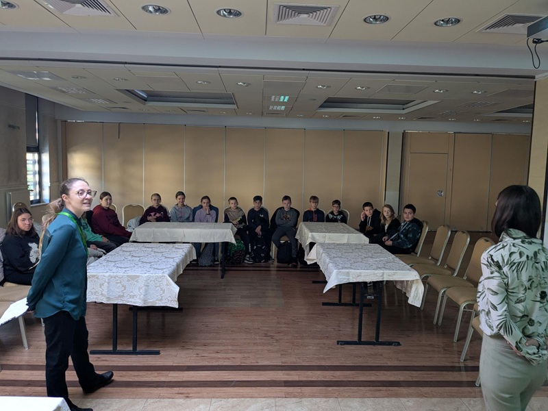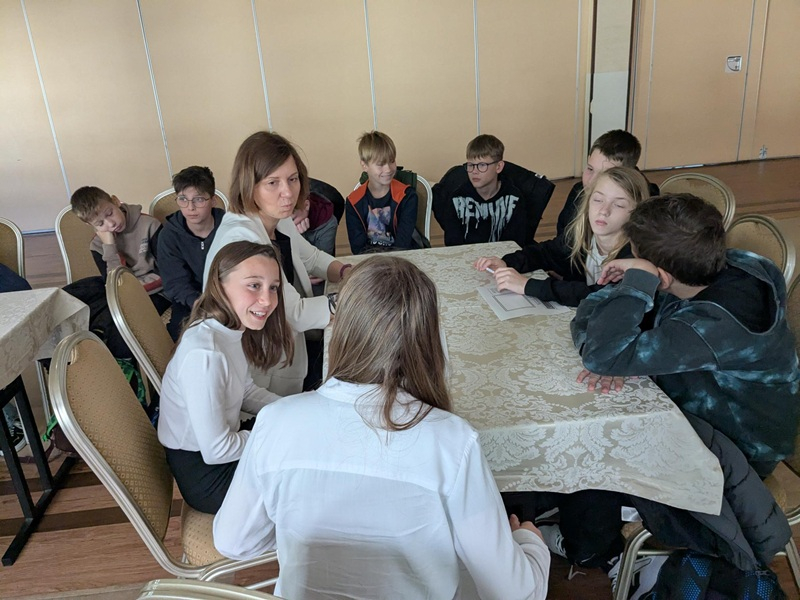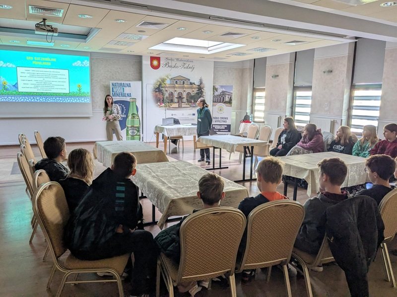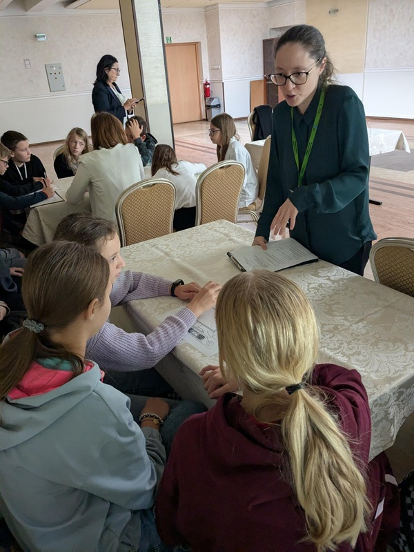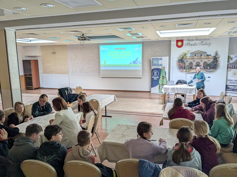 Pani Aleksandra i Pani Monika omówiły znaczenie odpoczynku, higieny cyfrowej oraz równowagi między światem wirtualnym a rzeczywistością. Uczniowie wykazali się dużym zaangażowaniem, aktywnie uczestnicząc w dyskusjach i dzieląc się swoją wiedzą oraz doświadczeniami. Następnie grupa miała okazję wysłuchać panelu dyskusyjnego Jak zdrowo jeść. Spotkanie poprowadziła pani Irena Sobieraj - starszy wizytator Kuratorium Oświaty w Kielcach, a zarazem przewodnicząca Oddziału Regionu Ponidzie Polskiego Towarzystwa Zdrowia Publicznego. Jednym z najciekawszych punktów wydarzenia był krótki spektakl pt. W świecie zagrożeń, przygotowany przez uczniów Zespołu Placówek Oświatowych w Tuczępach. Przedstawienie w obrazowy sposób ukazało codzienne zagrożenia, z jakimi mogą spotkać się dzieci i młodzież, a także sposoby ich unikania.