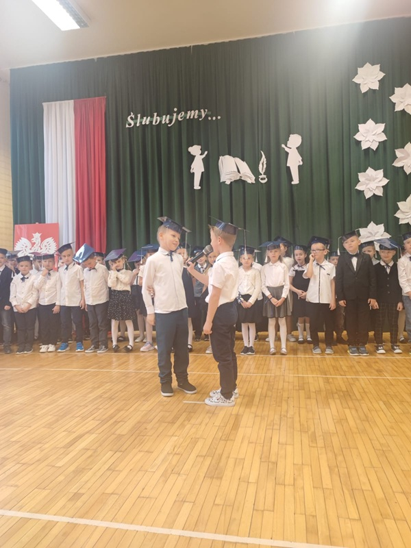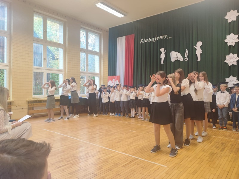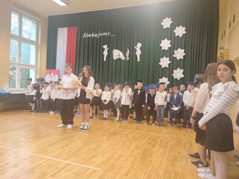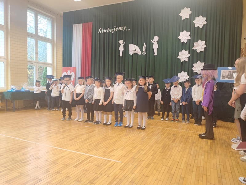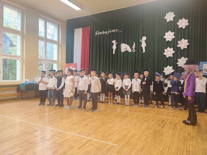 Wydarzenie rozpoczęło się od występu artystycznego i oficjalnego ślubowania pierwszoklasistów, którzy w obecności zaproszonych gości, dyrekcji, nauczycieli, rodziców i starszych kolegów złożyli uroczyste przyrzeczenie. Był to dla nich symboliczny moment włączenia do społeczności szkolnej – pełen wzruszeń, emocji i dumy. Nasi kochani pierwszoklasiści zaprezentowali niezwykle barwne i pomysłowe przedstawienie oparte na motywach „Akademii Pana Kleksa” Jana Brzechwy. Współczesna – nasza szkolna Akademia i sceny pełne magii, śmiechu i dziecięcej fantazji przeniosły wszystkich w niezwykły świat Pana Kleksa, a gra aktorska młodych wykonawców spotkała się z entuzjastycznym przyjęciem widowni.