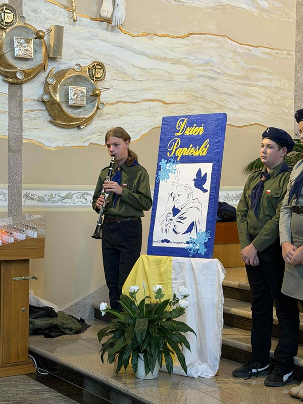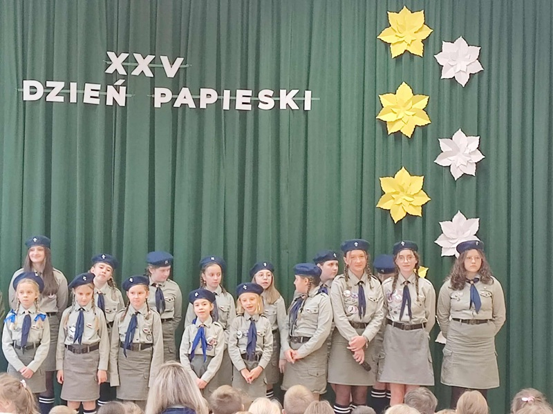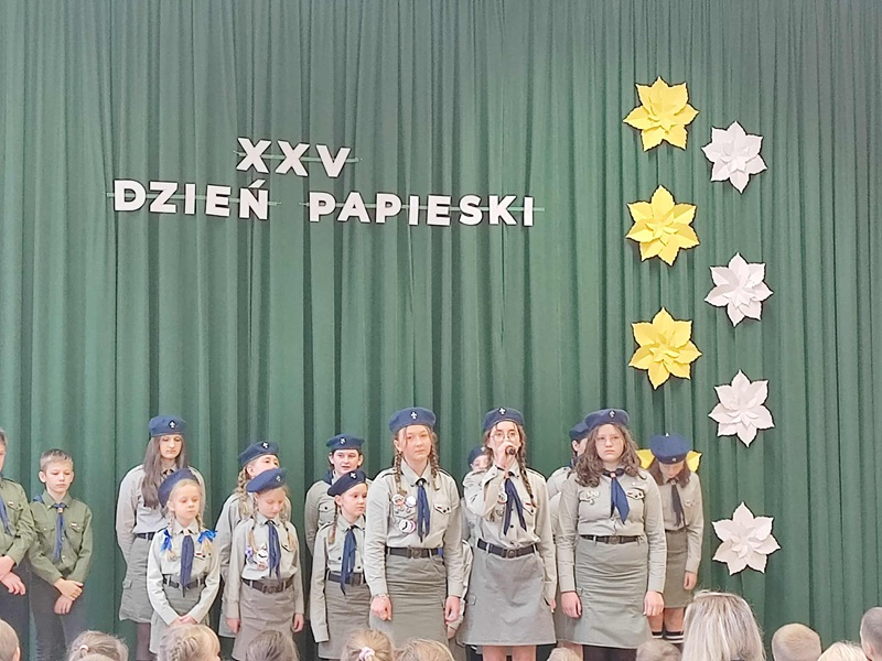 W dniu 16 października odbyła się uroczystość z okazji Dnia Papieskiego, upamiętniająca życie i nauczanie Św. Jana Pawła II. Harcerze przygotowali krótki program artystyczny, w którym poprzez recytację wierszy i śpiew pieśni religijnych, przypomnieli postać Papieża Polaka- człowieka nadziei. Występ dzieci poruszył wszystkich. Uroczystość była nie tylko okazją do wspólnego świętowania , ale też do refleksji nad wartościami, które Jan Paweł II pozostawił kolejnym pokoleniom.