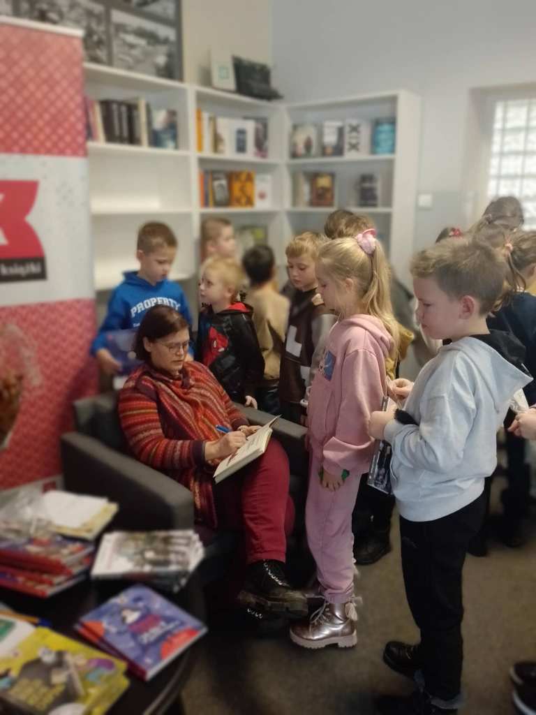 24 listopada uczniowie klasy II a wybrali się do Miejsko-Gminnej Biblioteki Publicznej w Busku-Zdroju na spotkanie z panią Anną Czerwińską-Rydel. Autorka wielu nagradzanych książek dla dzieci i młodzieży, znanych z fascynujących historii biograficznych i opowieści o wielkich Polakach, okazała się nie tylko znakomitą pisarką, ale też wspaniałą rozmówczynią. Od pierwszych minut porwała młodych słuchaczy swoją niezwykłą opowieścią o tym, skąd biorą się pomysły na książki i jak wygląda praca pisarza „od kuchni”.