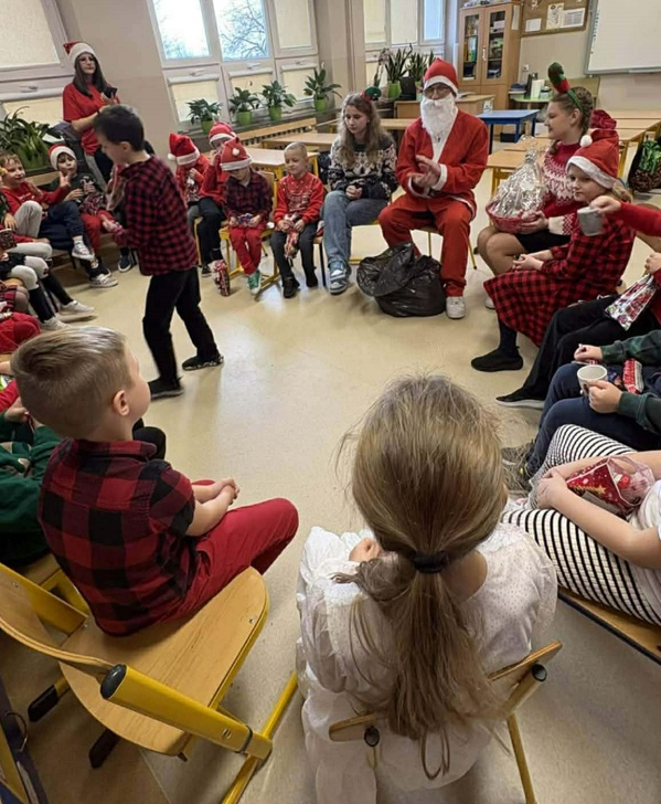 Po zakończeniu występu na salę wkroczył sam Święty Mikołaj, witając się serdecznie z wszystkimi dziećmi. W oddziale przedszkolnym wręczył maluchom prezenty osobiście, sprawiając im ogromną radość. Uczniowie klas I-III również otrzymali upominki - Mikołaj przekazał je do klas, gdzie dzieci mogły je później spokojnie odebrać.