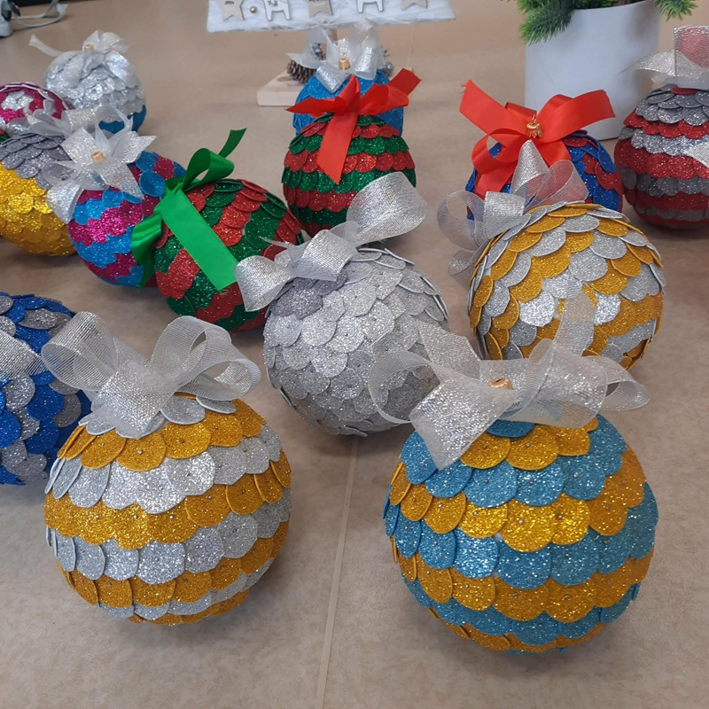 - „Bombeczki jak z bajeczki”- ozdabianie styropianowych bombek kółkami z pianki brokatowej.