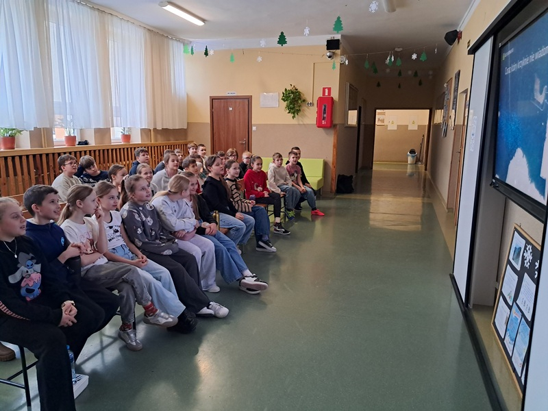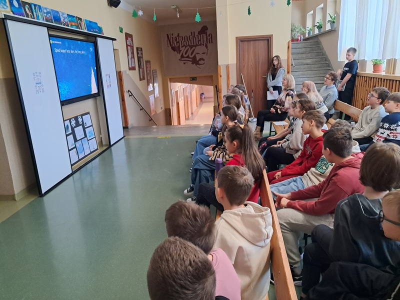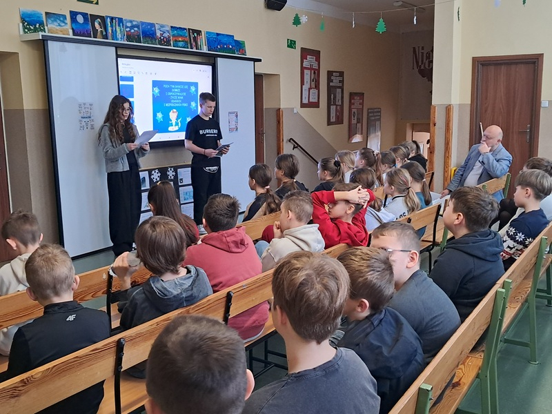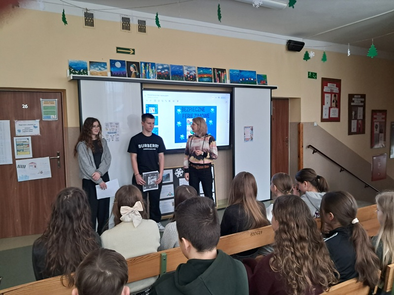 Podczas spotkania uczniowie zostali zapoznani ze sprawozdaniem dotyczącym działań zrealizowanych w I półroczu przez Samorządu uczniowski, przedstawiając najważniejsze inicjatywy i przedsięwzięcia podjęte na rzecz społeczności szkolnej. Nadia i Eryk przypomnieli najważniejsze zasady bezpieczeństwa podczas zimowego wypoczynku – zarówno w domu, jak i na świeżym powietrzu wspierając się przejrzystą, czytelną prezentacją multimedialną. Najmłodsi uczniowie otrzymali broszurki ze wskazówkami, które pomogą im bezpiecznie i radośnie spędzić ferie. Na zakończenie spotkania wszyscy wysłuchaliśmy wesołej piosenki zespołu Skaldowie - “Z kopyta kulig rwie” oraz Kraina Lodu “Mam tę moc”, do której śpiewania chętnie włączyła się znaczna część uczniów. Ten miły akcent wprowadził wszystkich w zimowy, feryjny nastrój.