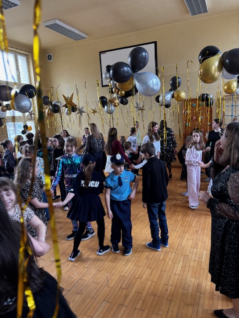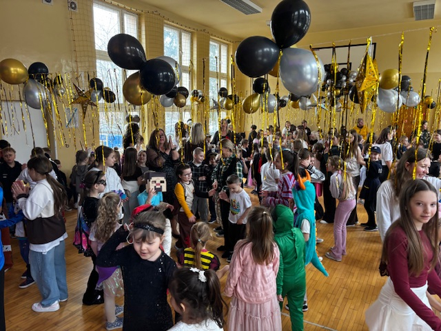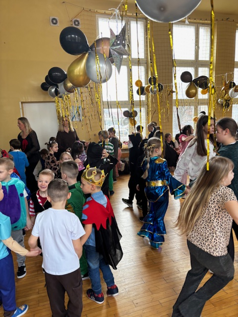 Pomysłowość i kreatywność dzieci zachwycały! Każda klasa przygotowała również przepyszne poczęstunki, które umilały chwile przerwy między tańcami. Pięknie przystrojona sala, kolorowe dekoracje i balony stworzyły wyjątkowy, karnawałowy klimat. Zabawa była świetna, pełna uśmiechu, energii i niezapomnianych wrażeń. Ten dzień na długo pozostanie w pamięci naszych najmłodszych uczniów.