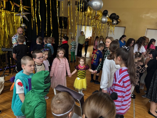 5 lutego w naszej szkole odbyła się wspaniała zabawa karnawałowa dla uczniów klas I–III. Tego dnia sala gimnastyczna zamieniła się w kolorową, bajkową przestrzeń pełną muzyki, tańca i radości. Dzieci bawiły się przy muzyce na żywo, która porwała wszystkich do wspólnych pląsów i zabaw tanecznych. Uczniowie byli przebrani za najróżniejsze postacie – można było spotkać księżniczki, superbohaterów, zwierzątka, policjantów, wróżki i wiele innych bajkowych bohaterów.