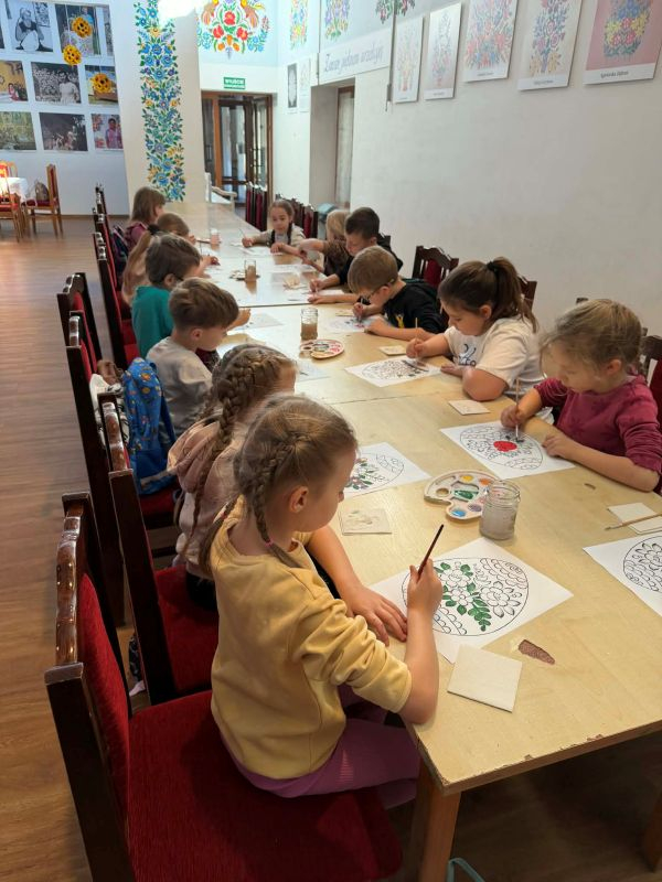 Podczas wizyty dzieci odwiedziły Dom Malarek, gdzie wzięły udział w zajęciach plastycznych. Z ogromnym zaangażowaniem i radością malowały pisanki farbami, rozwijając swoją kreatywność oraz zdolności manualne. Każde dziecko mogło stworzyć własną, niepowtarzalną ozdobę wielkanocną.