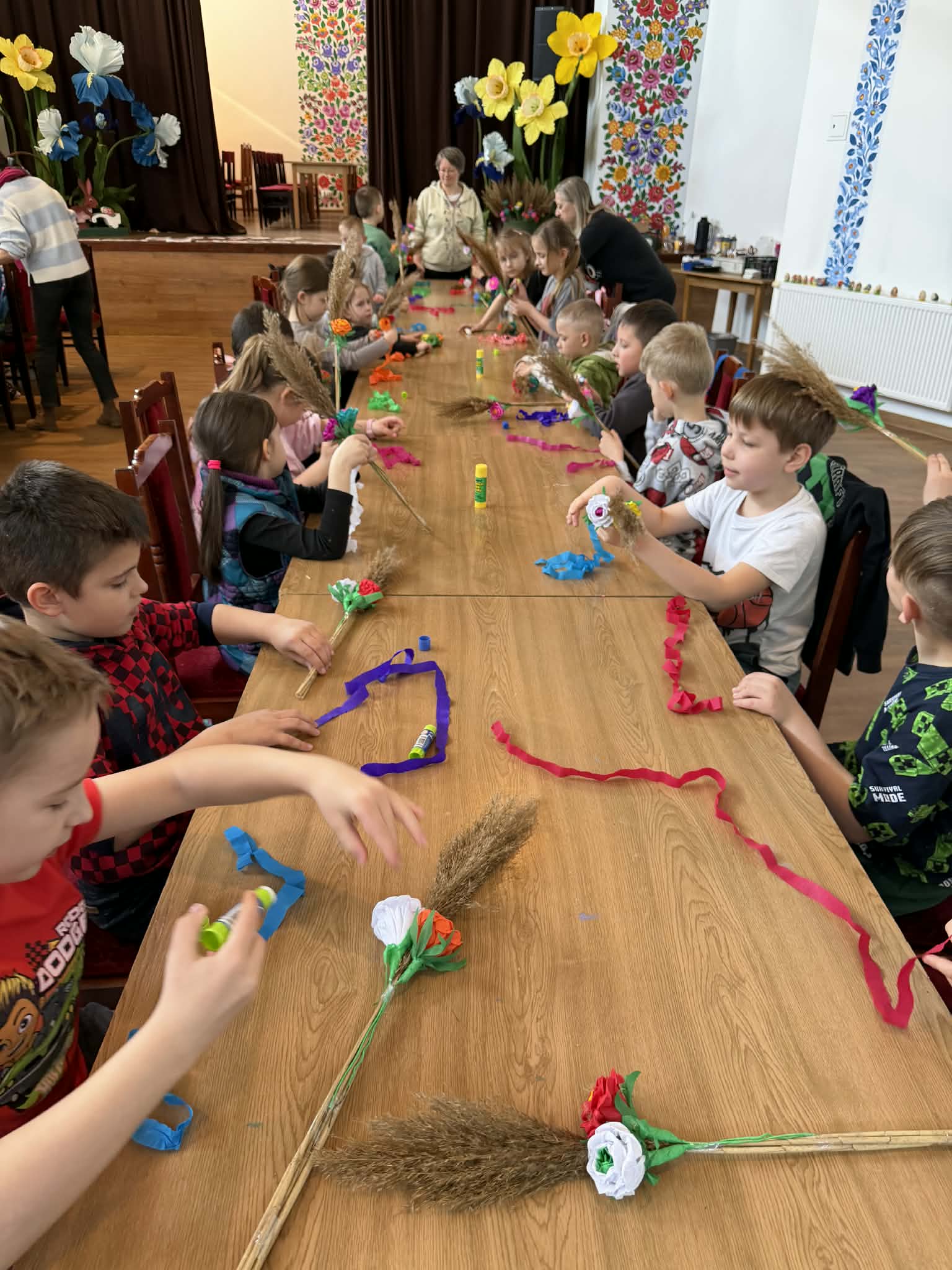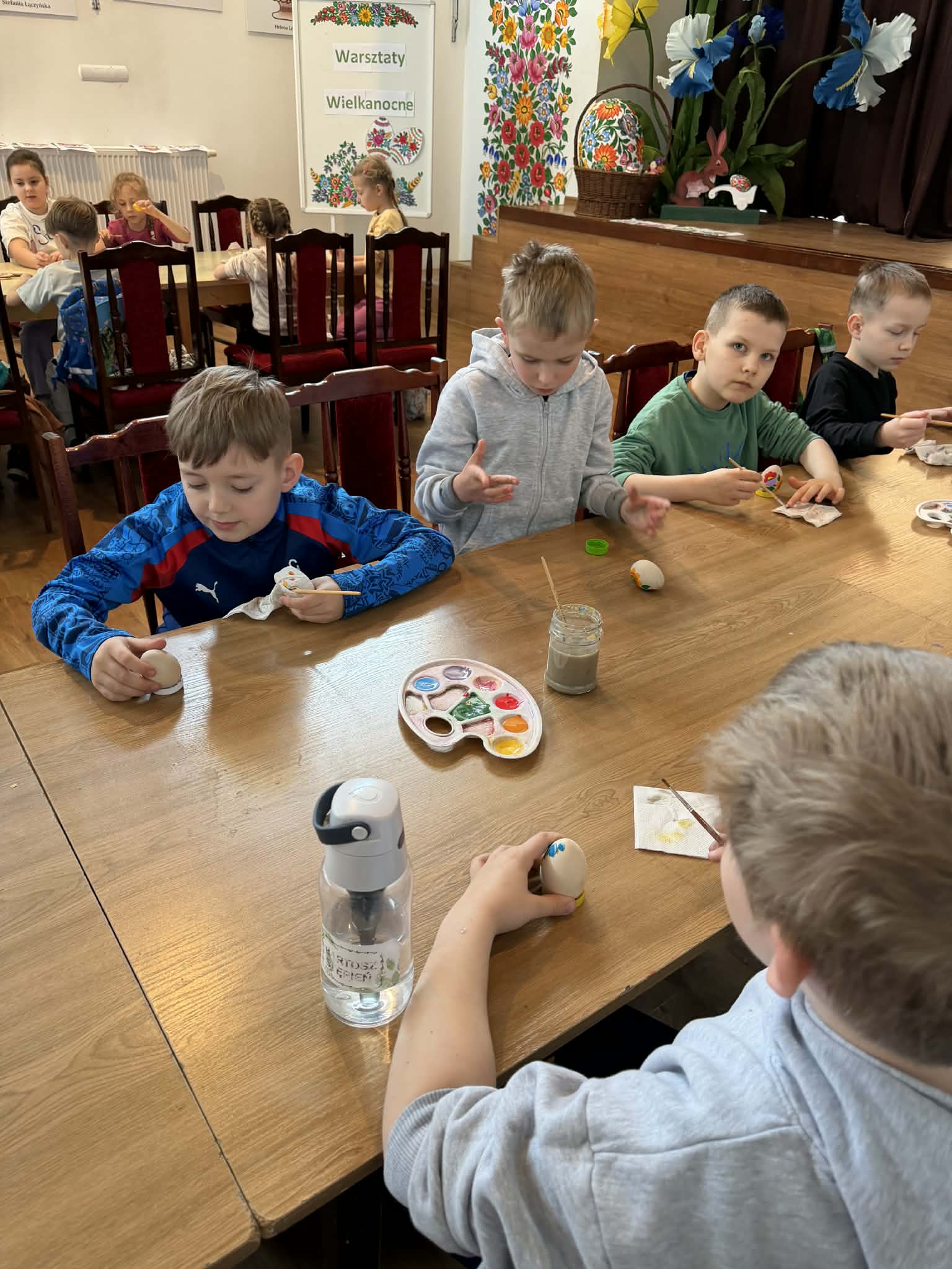 Kolejnym punktem warsztatów było ozdabianie palm wielkanocnych. Każdy uczeń otrzymał własną palmę do udekorowania, dzięki czemu mógł samodzielnie wykonać tradycyjną ozdobę świąteczną. Uczniowie poznali techniki jej zdobienia oraz znaczenie poszczególnych elementów, takich jak suszone kwiaty, gałązki czy kolorowe wstążki.