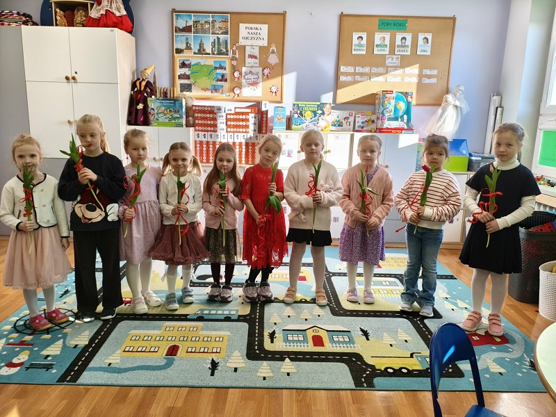 6 marca w naszej zerówce obchodziliśmy wyjątkowe święto – Dzień Kobiet. Tego dnia panowała bardzo miła i radosna atmosfera. Chłopcy z wielkim zaangażowaniem przygotowali niespodziankę dla swoich koleżanek z grupy. Każda dziewczynka otrzymała pięknego tulipana, który był symbolem życzliwości i pamięci  o tym szczególnym dniu. Chłopcy wręczali kwiaty z uśmiechem i składali serdeczne życzenia. Oprócz kwiatów dziewczynki dostały również piękne prezenty, które sprawiły im wiele radości.