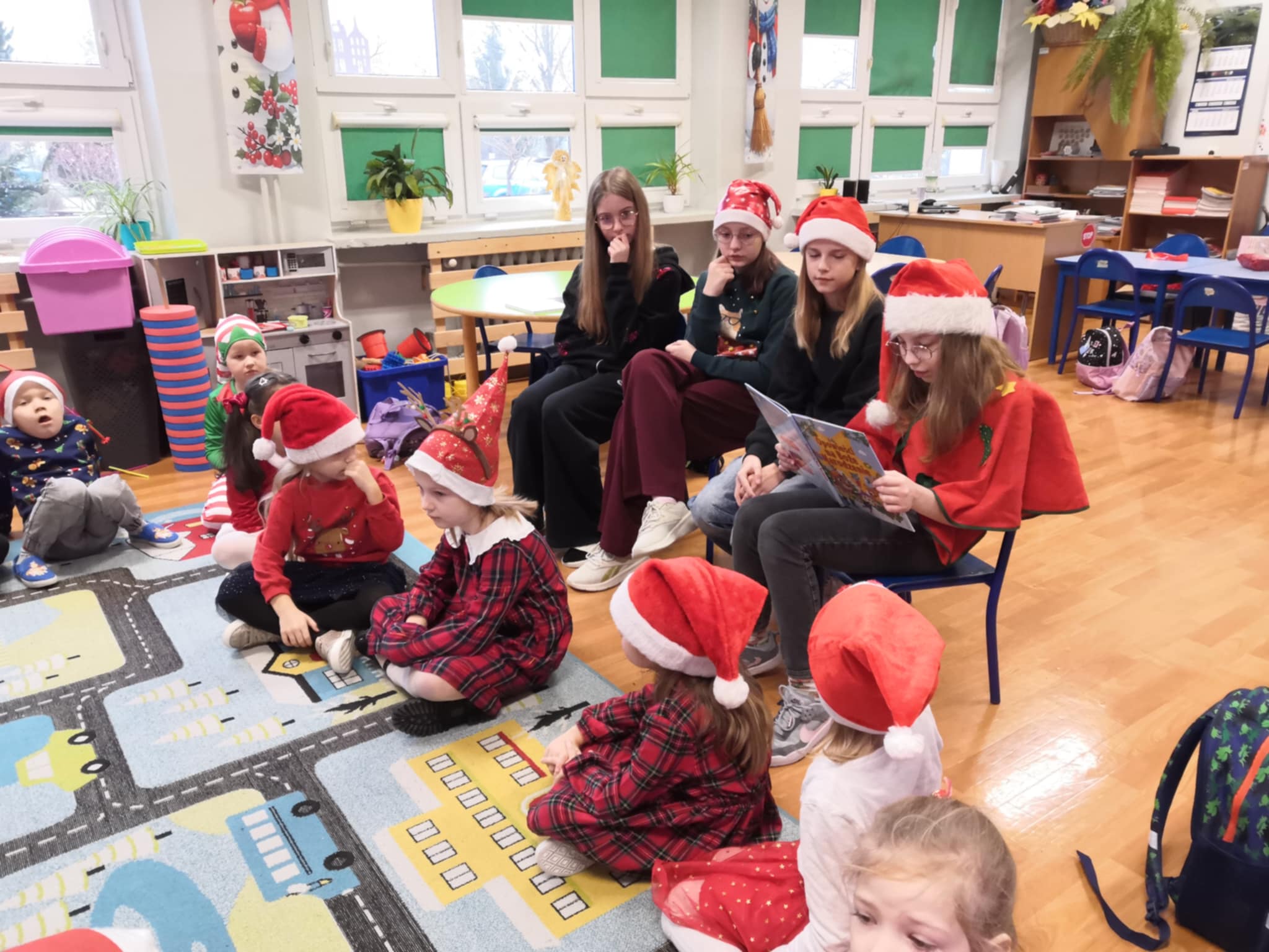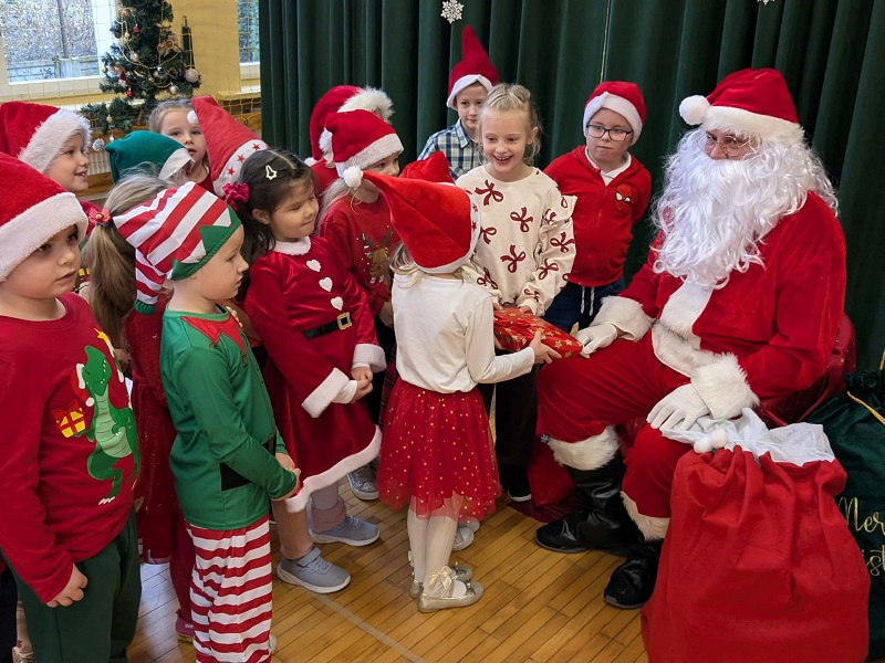 W piątek w naszej szkole panowała wyjątkowa, świąteczna atmosfera. Dzieci z niecierpliwością oczekiwali wizyty Świętego Mikołaja. Aby umilić dzieciom ten czas, uczniowie klas drugich przygotowali dla nich specjalne przedstawienie mikołajkowe. Młodzi aktorzy zaprezentowali wesołe scenki i świąteczne piosenki, które wprowadziły wszystkich w magiczny nastrój.