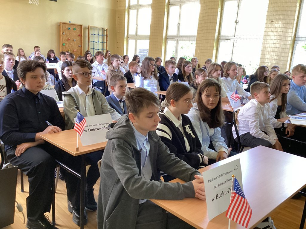 Otwarcia uroczystości dokonali goście honorowi - Pan Adrian Pratt, Konsul ds. Prasy i Edukacji oraz Pan Przemysław Nowak, Dyrektor Publicznej Szkoły Podstawowej im. Jana Pawła II w Zbludowicach. Słowa uznania dla pracy uczestników Konkursu, uczniów i nauczycieli, wygłosiła również Pani Anna Bilewska, Starszy Wizytator Kuratorium Oświaty w Kielcach, a Panie Monika Durlik i Anna Majcher przybliżyły obecnym na spotkaniu Gościom jego ideę, cele, tematykę oraz zasięg. Po trwających 2 godziny zmaganiach konkursowych Pani Janina Galas, koordynator Konkursu z ramienia Konsulatu Generalnego Stanów Zjednoczonych w Krakowie, ogłosiła jego wyniki. Uroczystego wręczenia nagród dokonali Pan Jerzy Szydłowski, Burmistrz Miasta i Gminy Busko-Zdrój, Pan Piotr Kaczocha, Zastępca Burmistrza Miasta i Gminy Busko-Zdrój, Pan Konsul Adrian Pratt oraz Pan Przemysław Nowak, Dyrektor Publicznej Szkoły Podstawowej im. Jana Pawła II w Zbludowicach .