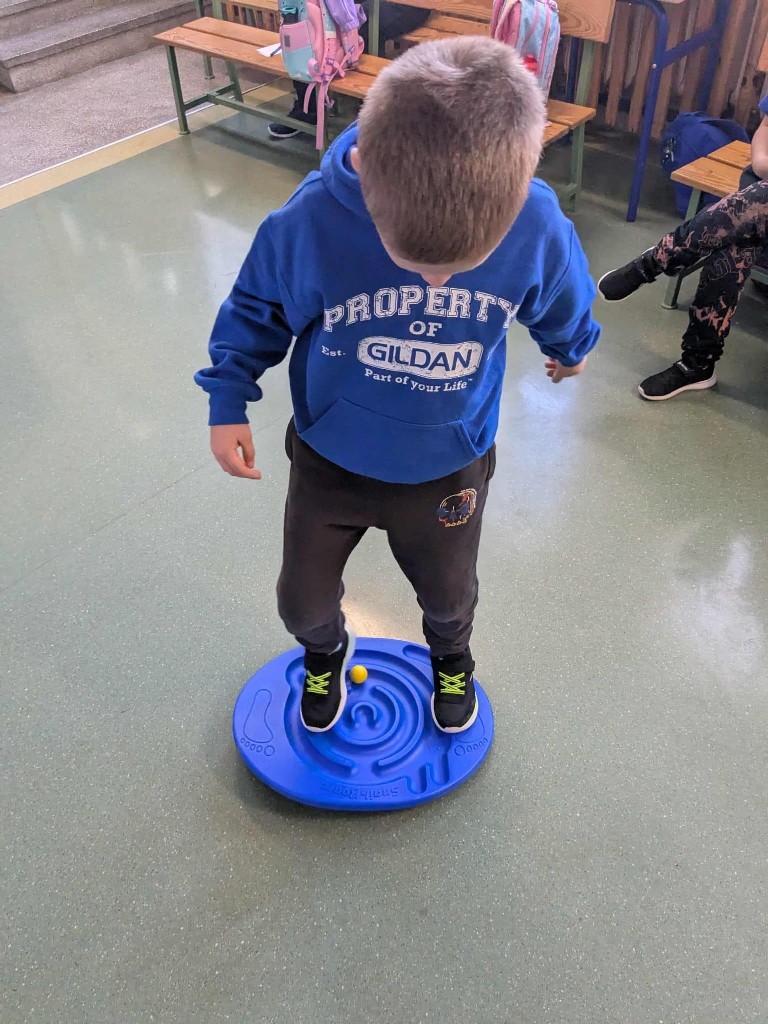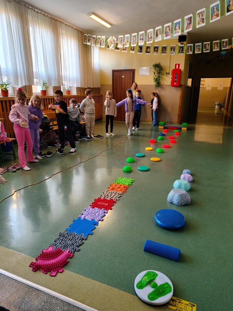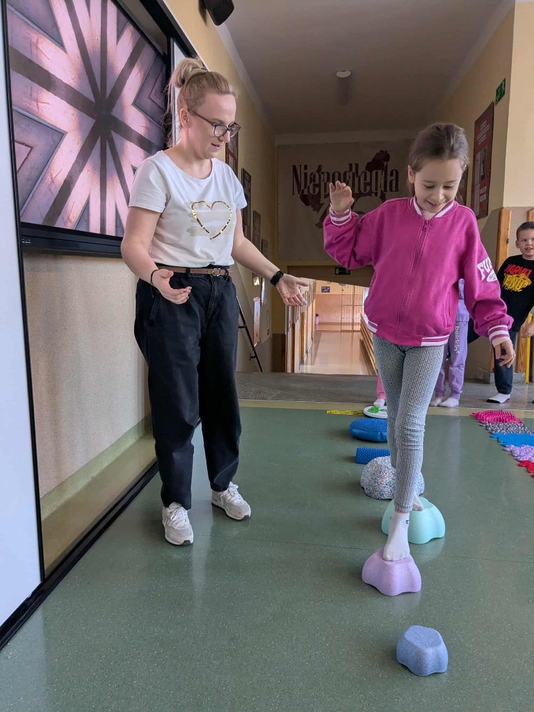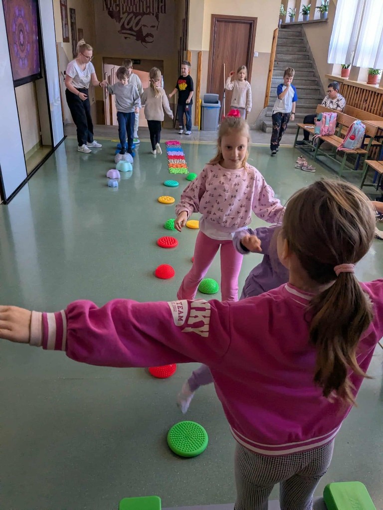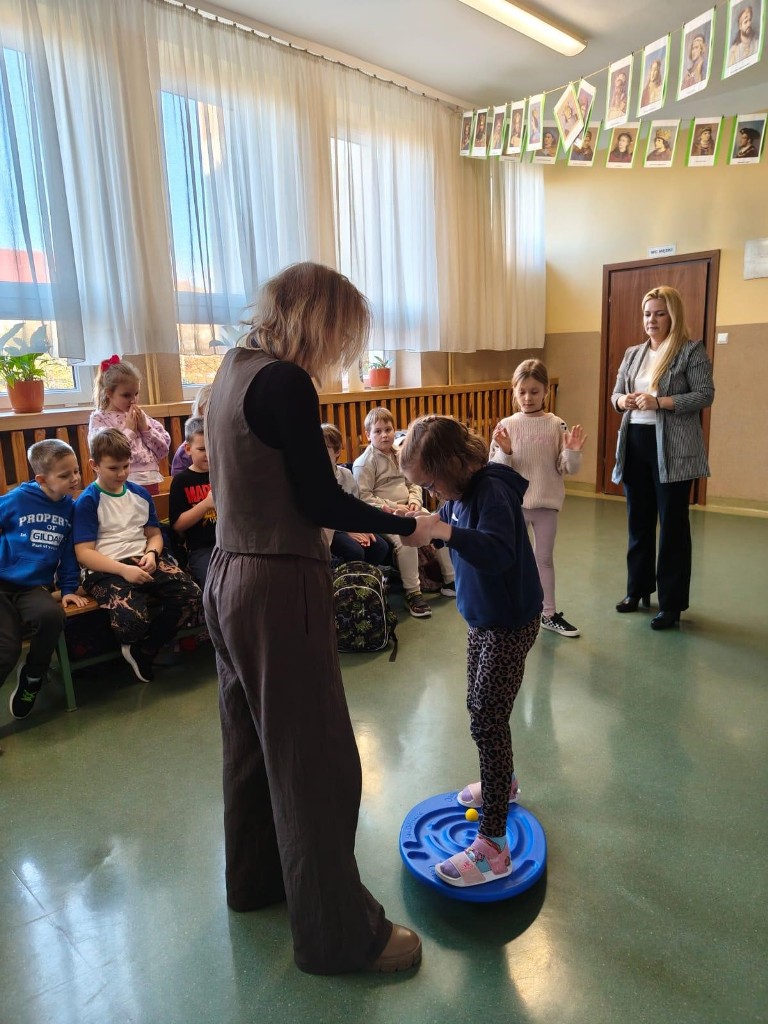 Listopad upłynął pod znakiem ruchu i równowagi. Uczniowie pokonywali tory przeszkód, ćwiczyły chodzenie po linie oraz brały udział w zabawach z piłkami. Aktywności te rozwijały motorykę dużą, poprawiały koordynację i sprawność fizyczną, a także uczyły współpracy i wzajemnego wsparcia w grupie.