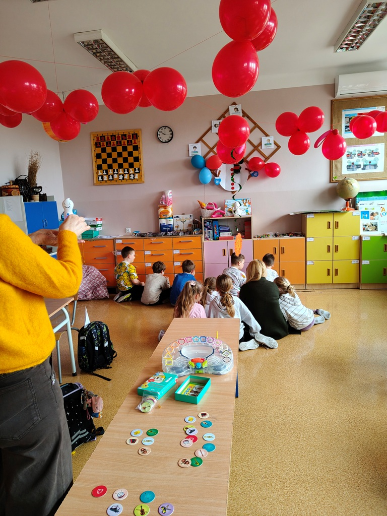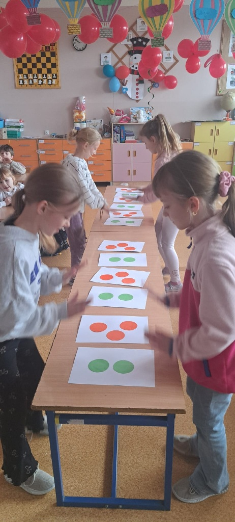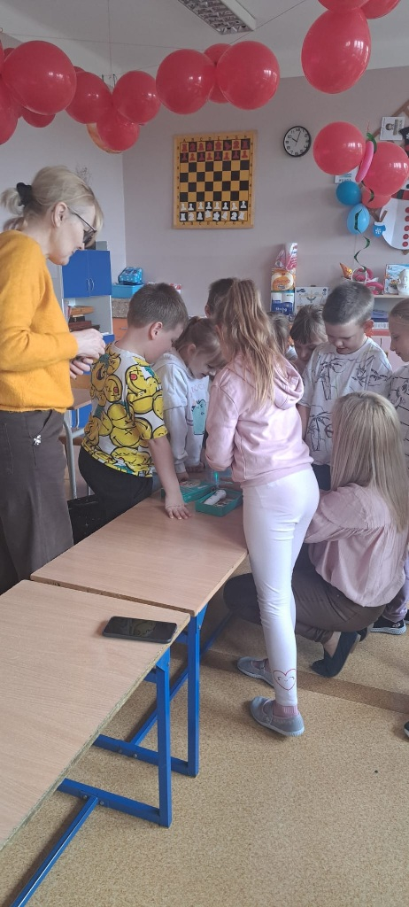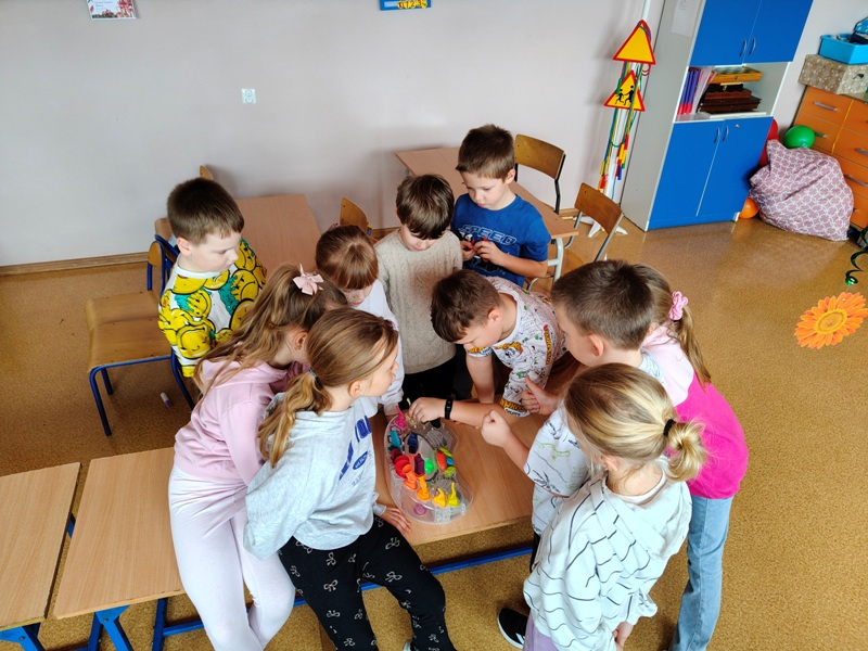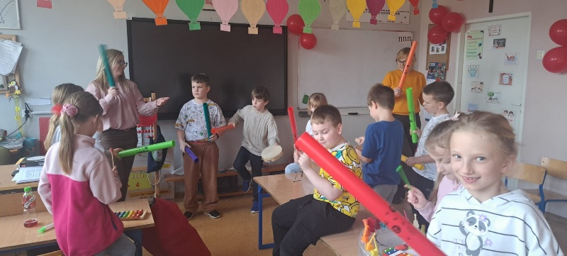 Młodsi uczniowie uczestniczyli w aktywnych zabawach muzycznych. Podczas rozmowy o rytmie i dźwiękach poznawali instrumenty, a następnie w parach odtwarzali proste rytmy przez klaskanie lub stukanie. Kolejnym zadaniem było rozpoznawanie instrumentów przy pomocy gry memo „Poznaję dźwięki” i elektronicznego długopisu ALBIK. Zabawa wywołała wiele emocji i zachęciła do uważnego słuchania. Dużym powodzeniem cieszyło się komponowanie melodii przy użyciu interaktywnego pulpitu dyrygenta Symfonia B.Toys. Dzieci eksperymentowały z brzmieniami i odkrywały, jak zmienia się muzyka w zależności od instrumentu. Na zakończenie zajęć uczniowie stworzyli klasową orkiestrę, grając wspólnie na tamburynach, trójkątach, bębenkach i bum bum rurkach. Wspólne muzykowanie przyniosło im wiele radości i pokazało, jak ważna jest współpraca i twórcza zabawa.