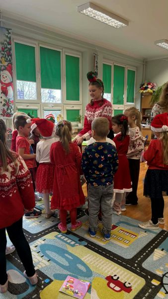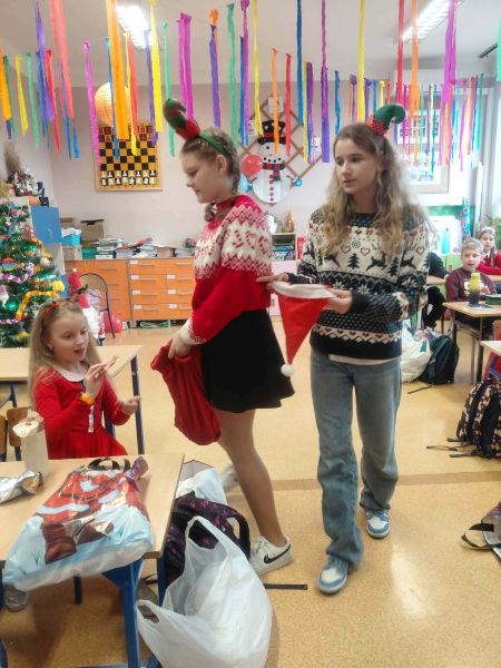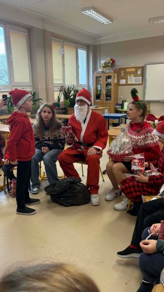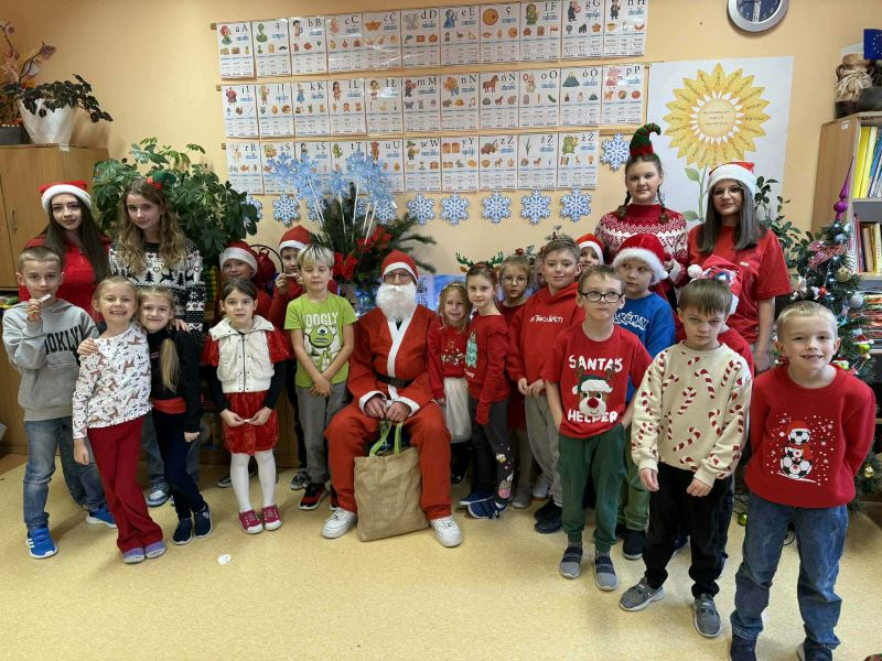 W tym roku uczniowie klas 0-3 przeżyli wyjątkowe Mikołajki. W ramach akcji „starsi – młodszym” starsi uczniowie naszej szkoły wcielili się w rolę Mikołaja i jego pomocnych elfów. Odwiedzili młodsze klasy, przynosząc ze sobą mnóstwo uśmiechów i świątecznej energii. Dzieci i nauczyciele mieli na sobie świąteczne czapki, sweterki oraz błyszczące dodatki, które dodały wydarzeniu wyjątkowej atmosfery.
