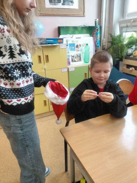Największą atrakcją było losowanie „szczęśliwych losów”, w których ukryte były słodkie niespodzianki i prezenty. Radość i ekscytacja uczniów były ogromne – każdy mógł poczuć prawdziwą magię świąt! To był dzień pełen uśmiechów, zabawy i wspólnego świętowania, który na długo pozostanie w pamięci naszych najmłodszych.